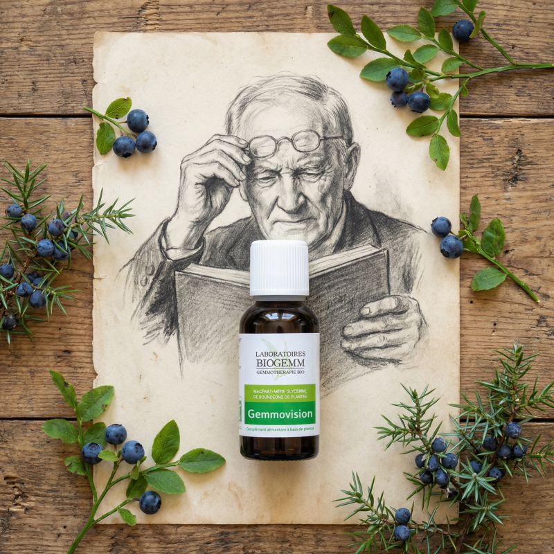 Le soutien naturel de votre regard : GEMMOVISION est un complexe de gemmothérapie conçu pour préserver la santé oculaire et améliorer le confort visuel. En associant le Myrtillier et le Genévrier, cette synergie agit sur la microcirculation des capillaires de l'œil et soutient les fonctions de régénération de la rétine. C'est l'allié idéal pour les personnes passant beaucoup de temps devant les écrans, ou pour accompagner le vieillissement naturel de l'œil.
