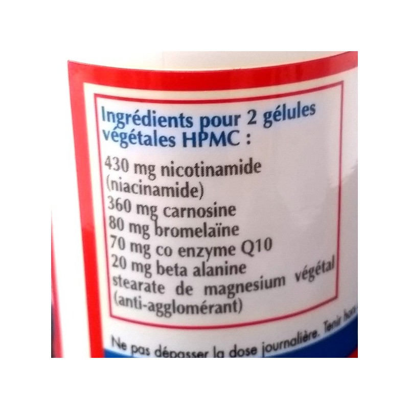 Des études ont également suggéré que la carnosine pourrait avoir des effets bénéfiques sur le développement de la parole et la longévité. La CoQ10 est connue pour ses propriétés antioxydantes. La carnosine peut contribuer à la souplesse de la peau. La niacinamide favorise l'activité d'une protéine.
