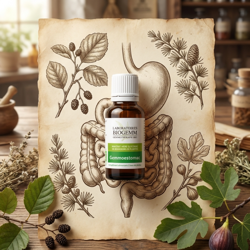 Le bouclier naturel de votre estomac : GEMMOESTOMAC est une synergie ciblée pour apaiser les muqueuses gastriques et réguler l'acidité. En combinant l'Aulne glutineux, le Cèdre du Liban et le Figuier, ce complexe agit efficacement contre les remontées acides et les brûlures. Il aide à calmer les tensions nerveuses qui se répercutent sur l'estomac tout en favorisant une cicatrisation et une protection durable des parois digestives.