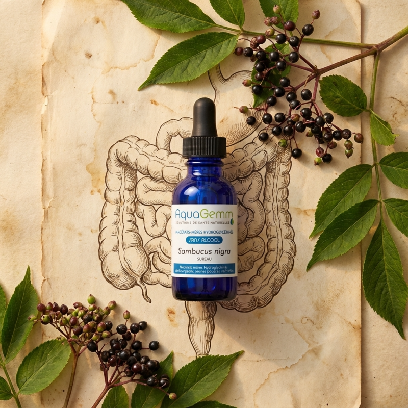 Le moteur naturel de votre bien-être digestif : Le macérât de SUREAU AQUAGEMM (Sambucus nigra) est une solution de référence pour faciliter le transit intestinal et purifier l'organisme. En favorisant naturellement l'élimination des toxines, ce macérât 100% bio et sans alcool aide à décomposer les aliments plus efficacement. Il est particulièrement recommandé pour soulager les digestions difficiles, les épisodes de constipation ou pour accompagner les personnes en phase de perte de poids. Que ce soit face au stress, à un changement d'alimentation ou pour réguler des désordres chroniques, le Sureau restaure le confort intérieur en douceur.