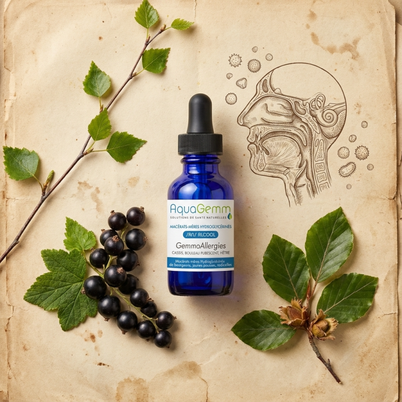 Votre bouclier naturel contre les allergènes : Le complexe GEMMO ALLERGIES AQUAGEMM est une synergie innovante de trois bourgeons (Cassis, Bouleau, Hêtre) spécifiquement sélectionnés pour leur action sur les troubles allergiques. Formulé sans alcool et 100% bio, ce macérât intervient sur les manifestations inconfortables telles que les éternuements, les démangeaisons et les gênes respiratoires. Que ce soit pour affronter la saison des pollens ou réagir à la présence d'allergènes environnementaux (poils, poussière), ce complexe aide l'organisme à mieux tolérer son environnement. Une solution douce et efficace pour retrouver un confort respiratoire tout au long de l'année.