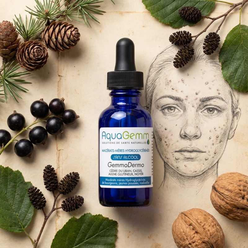Le soin profond pour une peau purifiée et éclatante : Le complexe GEMMO DERMO AQUAGEMM est une association experte de quatre bourgeons bio (Cassis, Aulne, Noyer, Cèdre du Liban) formulée sans alcool pour répondre aux divers troubles dermatologiques. Ce macérât agit sur l'équilibre cutané, aidant à réguler les irritations, les pellicules et les imperfections de la peau. Idéal en prévention pour maintenir une peau saine au quotidien ou dès l'apparition des premiers signes de déséquilibre, il convient à toute la famille. Sa pureté totale respecte les peaux les plus sensibles et s'intègre parfaitement dans tous les régimes alimentaires et pratiques religieuses.