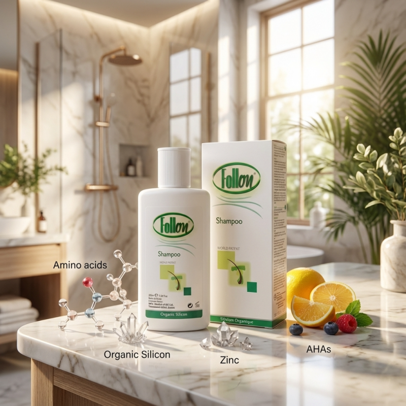 Le Shampoing FOLLON est un soin lavant spécifique conçu pour accompagner les traitements anti-chute. Sa formule unique agit en synergie avec les capsules pour assainir le cuir chevelu, renforcer la structure capillaire et créer un environnement favorable à la repousse. Grâce à l'intégration de Zinc, il aide à réguler l'équilibre du cuir chevelu dès la racine.