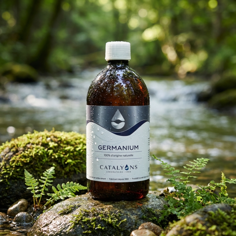 - Origine et Pureté Catalyons : Le procédé d'électrolyse breveté par Catalyons permet d'obtenir des ions libres (Ge2+) en suspension dans une eau ultra-purifiée. Cette forme est la plus proche de celle que l'on trouve dans les plantes médicinales (comme le Ginseng ou l'Ail), garantissant une assimilation totale sans toxicité pour les reins.