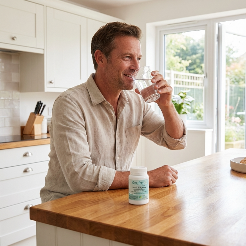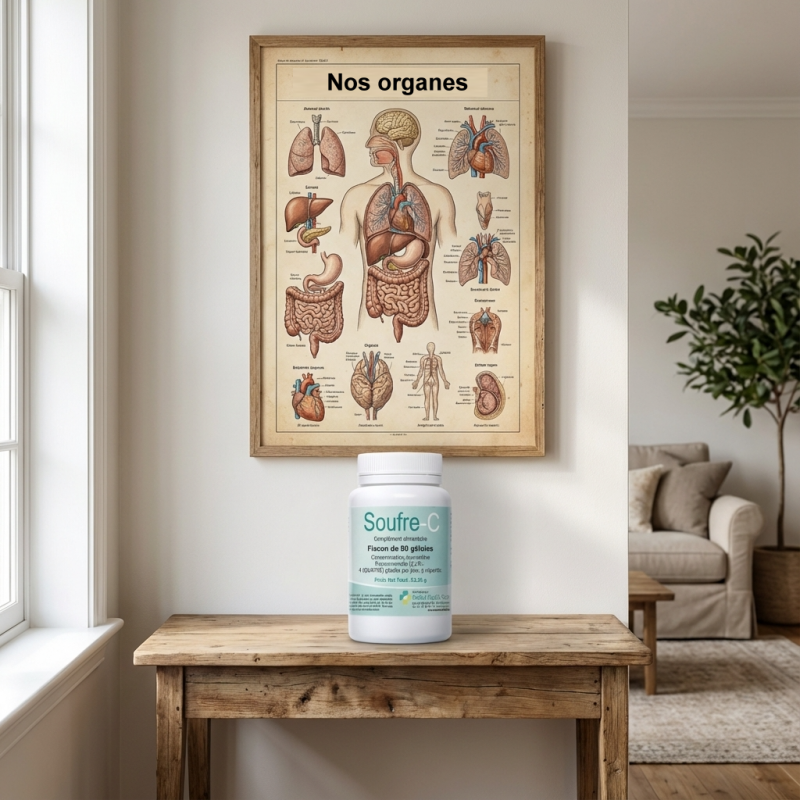 Le SOUFRE C a été spécifiquement élaboré pour répondre aux besoins de l'organisme en composés soufrés biodisponibles. Dans notre environnement actuel, le corps est constamment sollicité par des polluants (pesticides, métaux lourds, additifs). La sulfoconjugaison est l'une des voies majeures de détoxification du foie, mais elle nécessite un apport constant en soufre pour fonctionner de manière optimale.