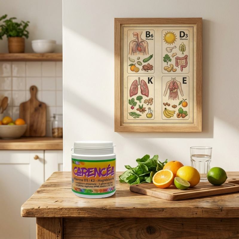 Équilibre et Protection : En apportant une dose optimale de Vitamine D3 couplée à la Vitamine K2 (indispensable pour fixer le calcium dans les os), CARENCEA protège votre capital osseux. L'ajout de Spiruline et de Fucus (iode naturel) vient stimuler votre métabolisme pour retrouver tonus et sérénité globale.