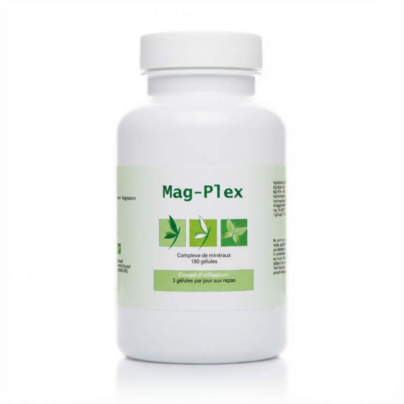 MAG-Plex est un complément alimentaire de haute qualité conçu pour pallier les carences en magnésium. Sa formule repose sur l'utilisation du glycinate de magnésium, une forme chélatée reconnue pour sa biodisponibilité exceptionnelle et sa grande tolérance digestive.
