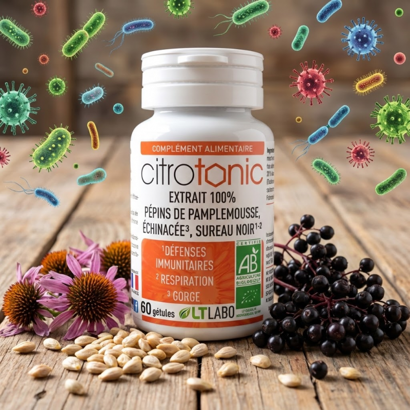Le CITROTONIC BiO est un allié précieux pour traverser sereinement les périodes d'agressions extérieures. Sa force réside dans la sélection rigoureuse de ses actifs : un extrait de pépins de pamplemousse (ratio 4:1), de l'échinacée pourpre cultivée en France (ratio 5:1) et du sureau noir (ratio 16:1). Cette concentration élevée permet d'offrir à votre organisme les molécules protectrices dont il a besoin pour réagir rapidement face aux premiers signes de refroidissement.