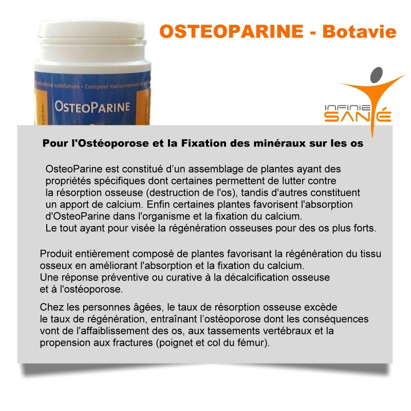 - contribue à Favoriser l'assimilation des nutriments : Les plantes contenues dans l'Ostéoparine peuvent contribuer à améliorer l'assimilation des minéraux et vitamines nécessaires au maintien d'une ossature normale.