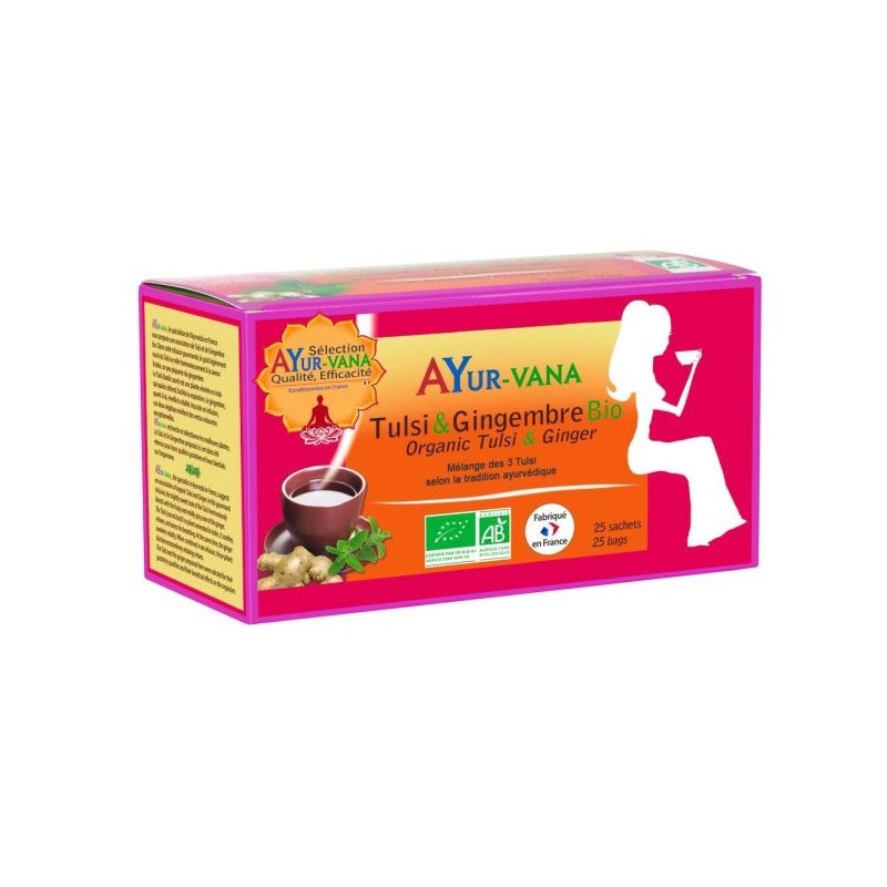 L’Infusion Tulsi et Gingembre Bio d'Ayur-Vana offre une expérience sensorielle unique, mêlant les notes poivrées et citronnées du Basilic Sacré au piquant tonique de la racine de Gingembre.