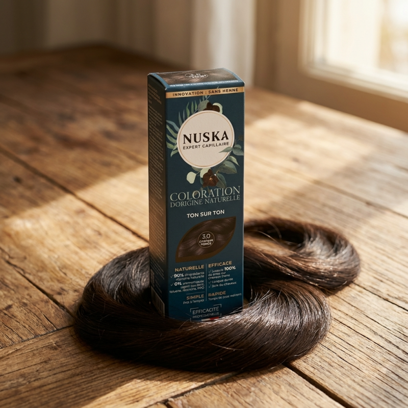 La Coloration Nuska n°3 Châtain Foncé est une solution de coloration d'origine naturelle, conçue et fabriquée en France. Sa formule, testée et validée par des coiffeurs professionnels, contient plus de 90% d'ingrédients naturels.