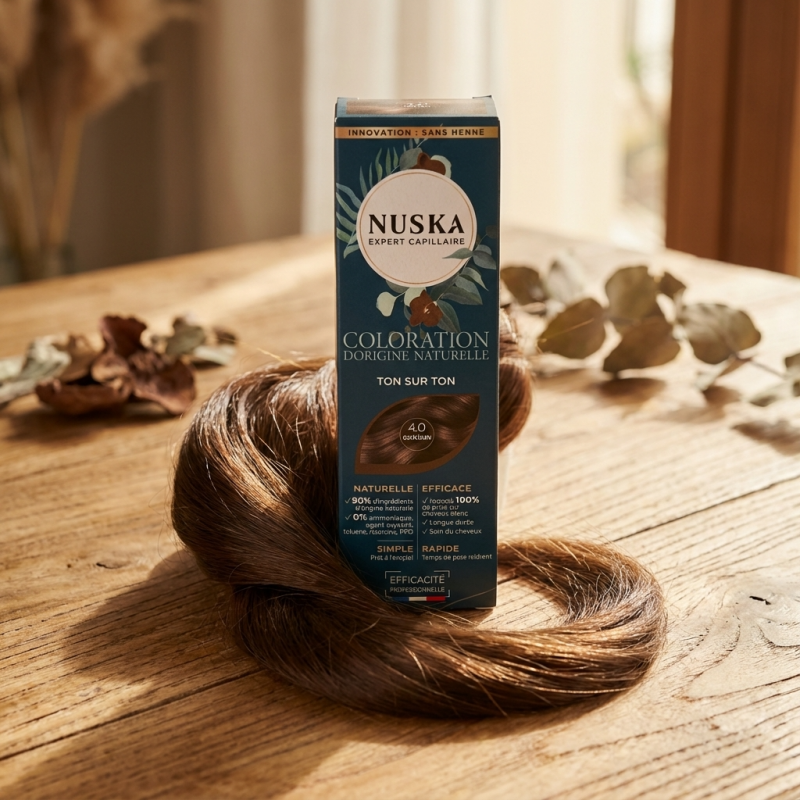 Coloration Nuska, Chatain Clair n5, coloration naturelle, sans henne, sans ammoniaque, couverture cheveux blancs, fabrication francaise, coloration ton sur ton, soin capillaire naturel, sans PPD, sans resorcine, efficacite professionnelle