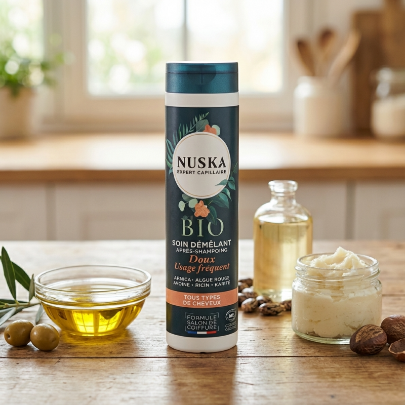 Le Soin Démêlant Nuska est un après-shampoing doux conçu pour un usage fréquent sur tous les types de cheveux. Sa formule 100% naturelle a été mise au point, testée et validée par des coiffeurs professionnels pour offrir une expérience de salon directement chez vous. Certifié **Cosmos Organic** par Cosmebio, ce soin respecte votre cuir chevelu tout en garantissant une efficacité maximale. Son flacon de 200ml est entièrement recyclé et recyclable.