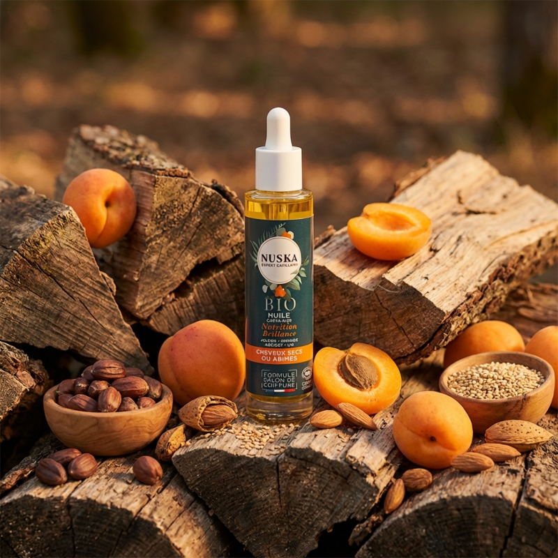 L'HUILE CAPILLAIRE NUTRITION ET BRILLANCE NUSKA est un élixir précieux certifié BIO, formulé pour transformer instantanément les chevelures sèches, ternes ou dévitalisées en une matière soyeuse et lumineuse.