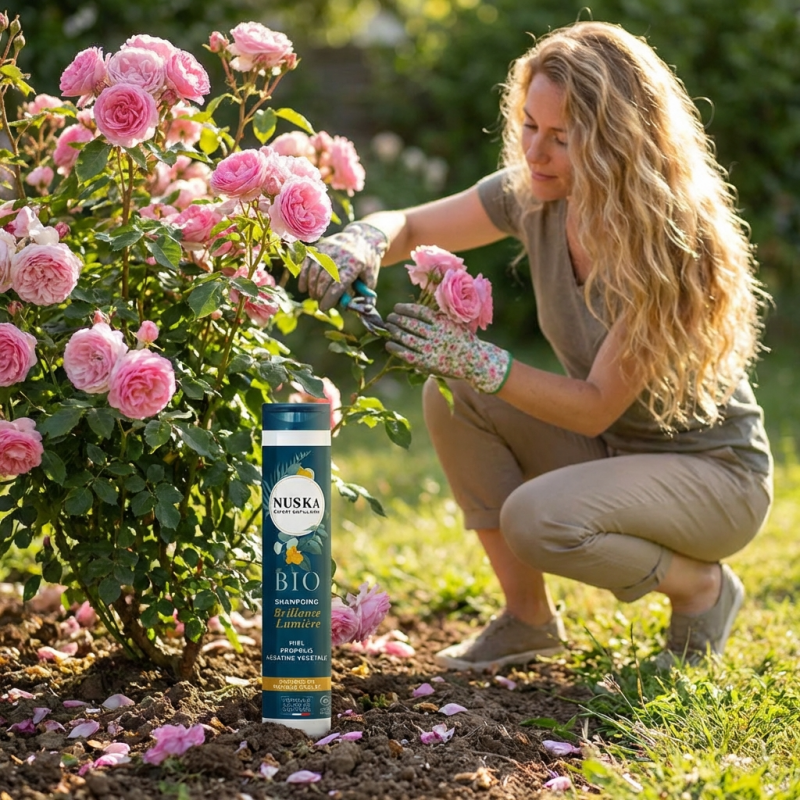 - Le rinçage à l'eau tiède : Pour préserver les reflets dorés apportés par la camomille et le curcuma, évitez l'eau trop chaude qui peut ternir le blond. Un dernier jet d'eau fraîche refermera les écailles pour une brillance maximale.