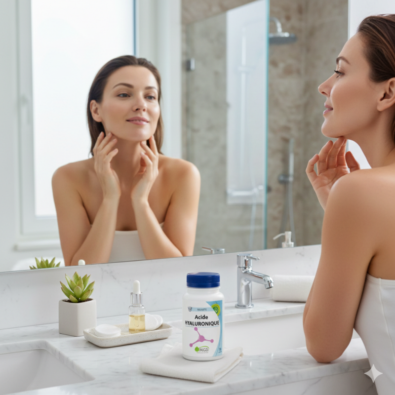 • Hyaluronate de sodium : Il s'agit de la forme sel de l'acide hyaluronique. Cette forme est privilégiée car elle est plus stable et possède une taille moléculaire permettant une meilleure biodisponibilité.