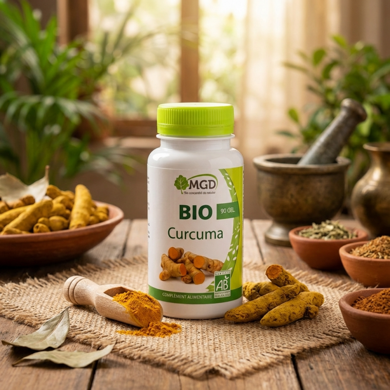 Le CURCUMA BIO de MGD Nature met à l'honneur le rhizome de *Curcuma longa*, une plante sacrée d'Asie du Sud. Utilisé depuis des millénaires en médecine ayurvédique, le curcuma est aujourd'hui plébiscité par la science moderne pour sa teneur en curcumine, un actif puissant qui aide l'organisme à moduler les réponses inflammatoires naturelles.