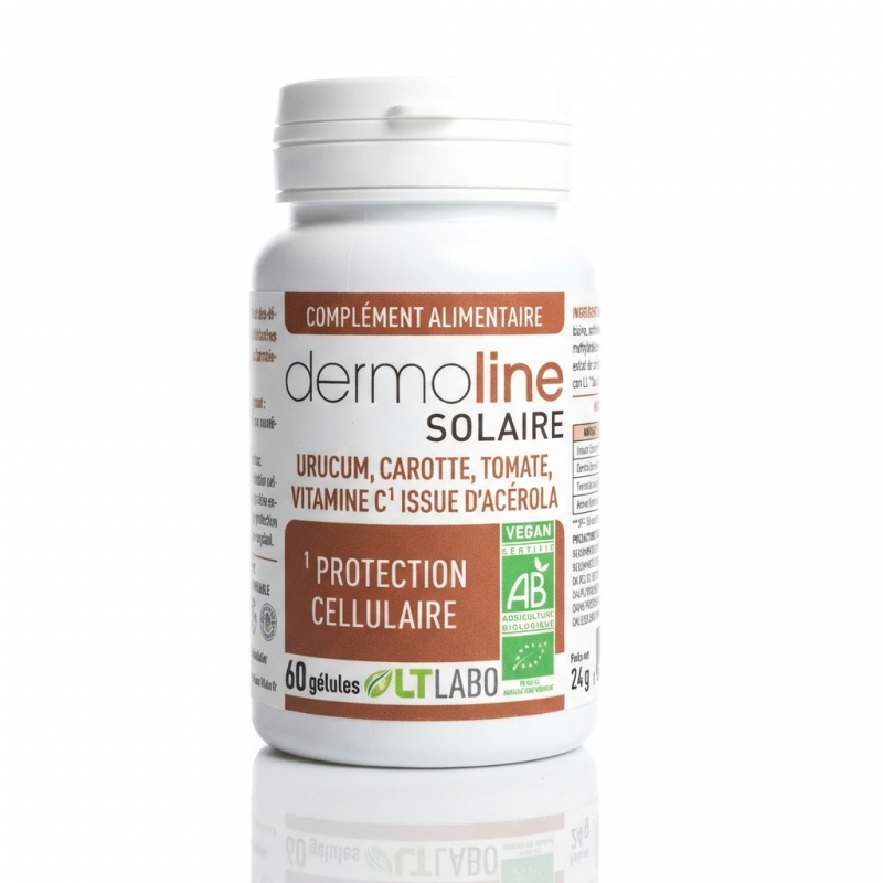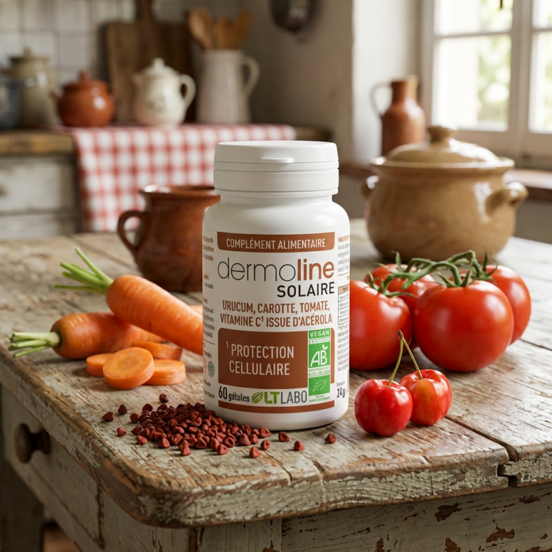 Le secret d'un hâle lumineux et d'une peau mieux préparée face au soleil : DERMOLINE Solaire de LT Labo est un complexe nutritionnel biologique conçu pour nourrir la peau de l'intérieur avant, pendant et après l'exposition. Sa formule hautement concentrée repose sur l'Urucum, une graine amazonienne exceptionnellement riche en bixine (famille des caroténoïdes), combinée aux extraits de Carotte et de Tomate. Enrichi en Vitamine C naturelle issue de l'Acérola, il stimule la synthèse de collagène et protège les tissus contre le vieillissement prématuré induit par les UV. Une solution naturelle pour sublimer votre bronzage tout en préservant la souplesse et l'hydratation de votre épiderme.