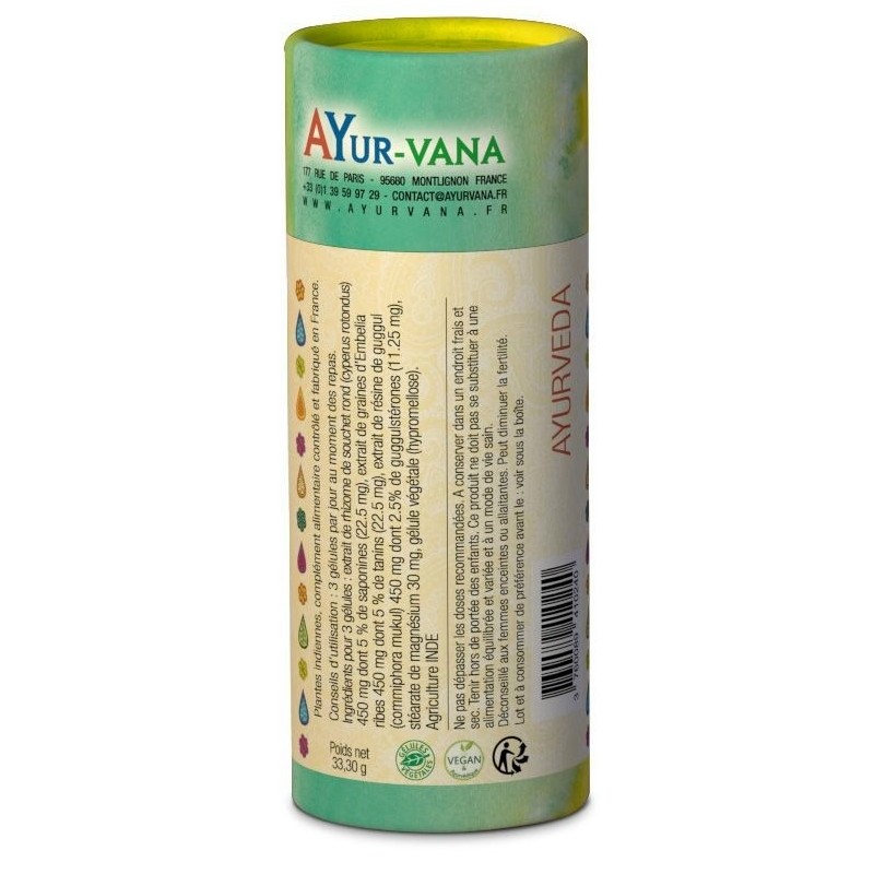 Ce complexe est idéal pour les personnes souffrant de raideurs matinales ou de gênes articulaires chroniques. Le Guggul, titré en guggulstérones, agit comme un modulateur naturel de l'inflammation, tandis que le Musta et le Vidanga assurent un équilibre intestinal optimal. C'est une solution globale pour maintenir une mobilité fluide et protéger les tissus osseux et cartilagineux contre le vieillissement prématuré.