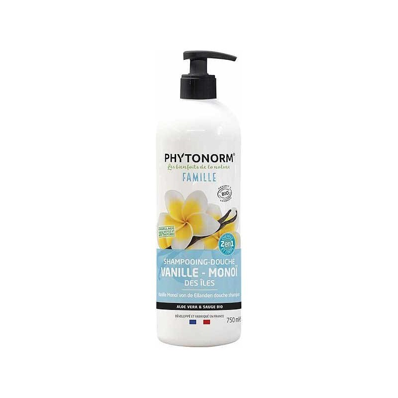 Le SHAMPOING DOUCHE VANILLE MONOI - 750 ml - Phytonorm est un soin d'hygiène complet 2-en-1, idéal pour un usage quotidien par toute la famille.
