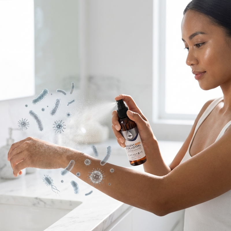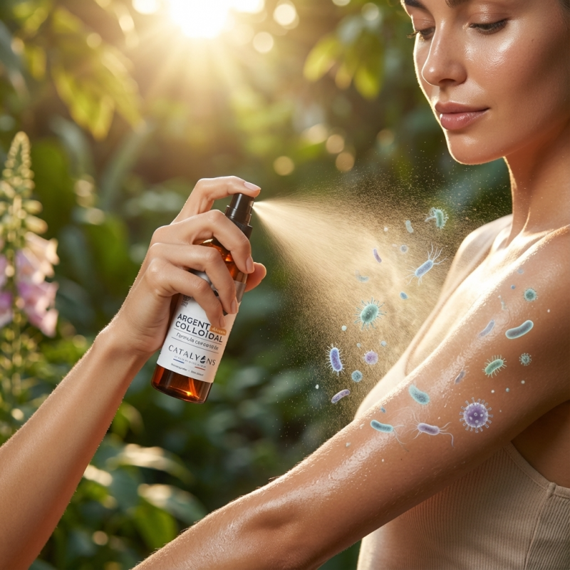 L'Argent Colloïdal 150 ml en spray des laboratoires Catalyons est une solution d'oligo-éléments ionisés hautement concentrée à 40 ppm. Ce format pratique permet une application ciblée et hygiénique, idéale pour l'assainissement rapide de la peau et des zones sensibles. Une concentration renforcée en format nomade Le procédé exclusif d'électro-catalyse des laboratoires Catalyons permet d'obtenir des ions d'argent d'une pureté absolue, immédiatement actifs. Pureté et Sécurité : Formulé avec de l'eau ultra-purifiée, sans aucun additif, conservateur ou composé chimique. Action Ciblée : La concentration à 40 ppm (40 mg/L) offre une intensité d'action supérieure pour les besoins de purification cutanée plus marqués. Propriétés Assainissantes : Aide à maintenir un environnement sain sur l'épiderme et les muqueuses buccales ou nasales.