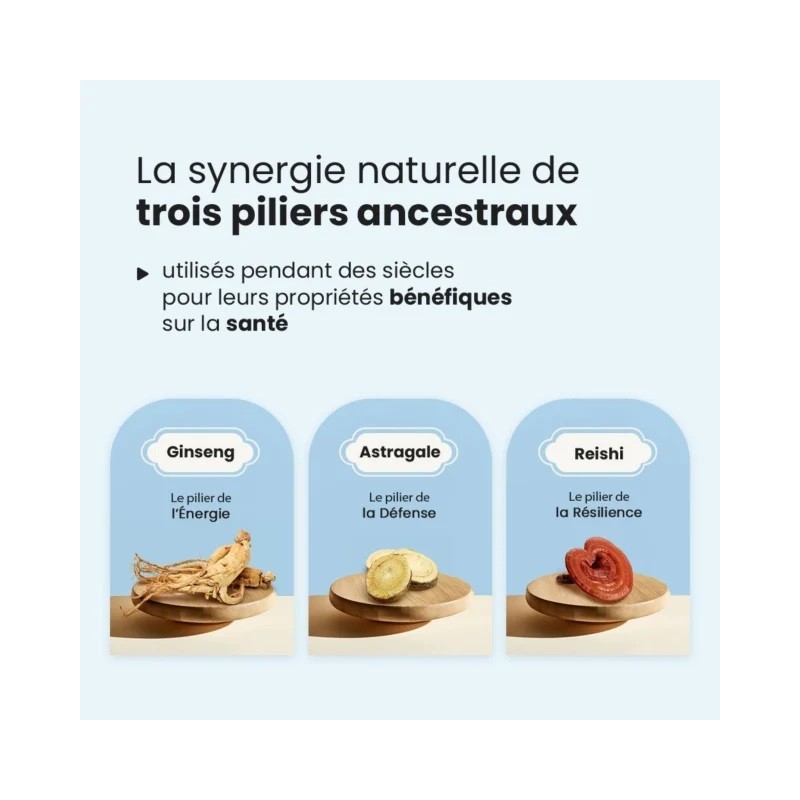 Grâce à la synergie du Ginseng, du Reishi et de l’Astragale, trois plantes adaptogènes majeures de la pharmacopée chinoise, notre formule ne cherche pas à sur-stimuler, mais à nourrir, soutenir et renforcer votre énergie vitale de manière progressive et durable.