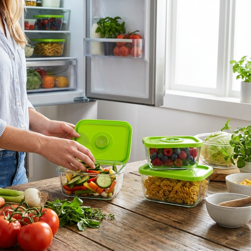 Les bacs sont en verre borosillicate épais et passent au four. Le couvercle est en ABS renforcé avec valve témoin de vide et dateur intégré. Les joints en silicone alimentaire sont quasi inusables.