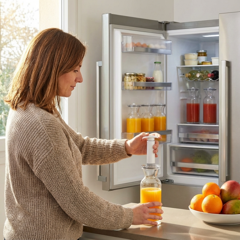 En extrayant l'air grâce à une pompe (non fournie), vous créez un environnement protecteur qui empêche l'oxygène d'altérer vos jus de fruits frais, smoothies, soupes froides ou vos vins entamés. Conçue en verre trempé de haute qualité, cette carafe offre une neutralité absolue : elle ne retient ni les odeurs, ni les colorations, garantissant une pureté totale à chaque utilisation. Sa robustesse exceptionnelle lui permet de résister aux chocs thermiques et mécaniques tout en restant élégante sur votre table. C'est l'accessoire indispensable pour tous ceux qui préparent des jus à l'extracteur et souhaitent conserver leurs vitamines et enzymes intactes pendant plusieurs jours au réfrigérateur.