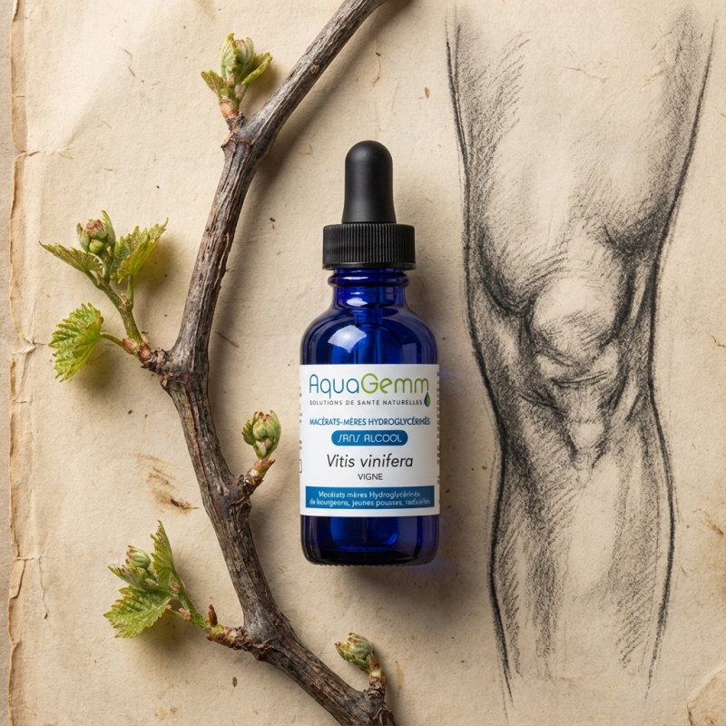 Le bouclier naturel contre les raideurs et les inflammations : Le macérât de VIGNE AQUAGEMM (Vitis vinifera) est une solution de choix en gemmothérapie pour préserver le confort de vos articulations. Reconnu pour ses puissantes propriétés anti-inflammatoires, ce macérât 100% bio et sans alcool aide l'organisme à se protéger naturellement des agressions liées aux processus inflammatoires chroniques. Il favorise la souplesse et la mobilité tout en agissant en profondeur sur les tissus conjonctifs. Sa formulation pure et douce accompagne durablement ceux qui souhaitent retrouver une aisance de mouvement au quotidien, sans les contraintes de l'alcool.