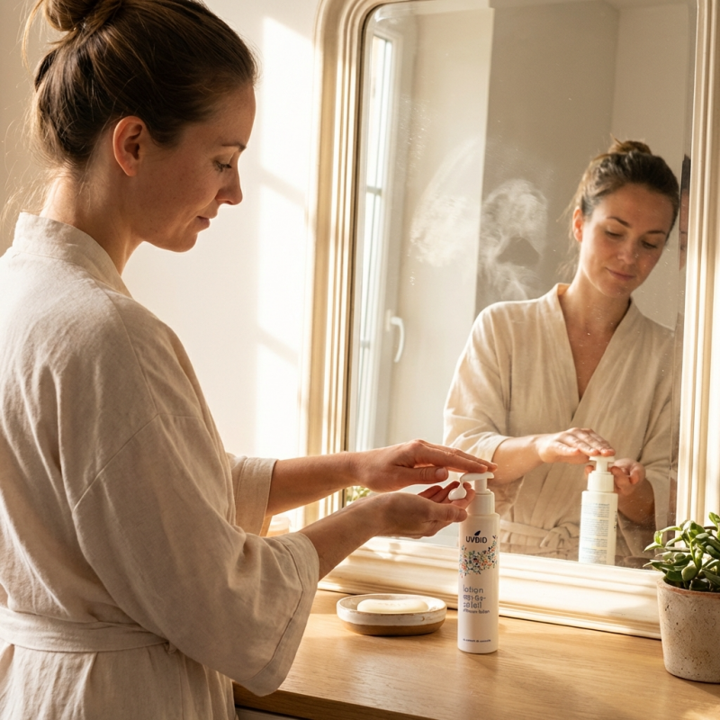 Duo de Choc : Pour une peau ultra-magnifiée, mélangez une goutte d'Huile Sèche UVBIO à votre lotion dans le creux de votre main avant l'application.