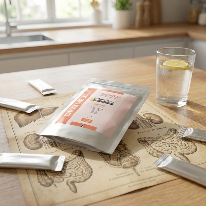 Action Détox et Drainage : Grâce à une synergie de 6 actifs d'origine végétale, ce draineur agit sur les principaux émonctoires (reins, foie, intestins). Il favorise l'élimination de l'eau stockée en excès, réduit les sensations de gonflement et aide à évacuer les déchets métaboliques accumulés lors des changements de saison ou après des excès alimentaires.