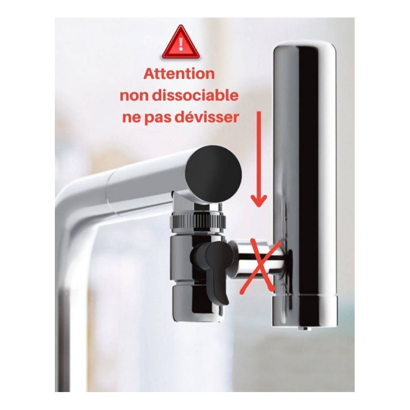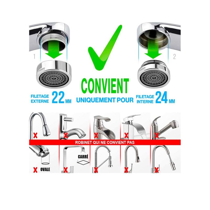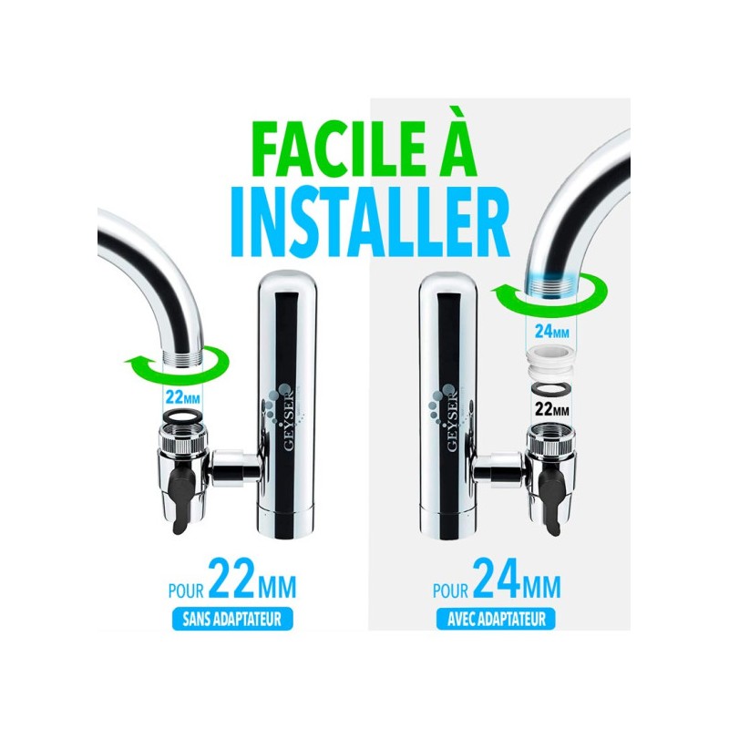 | Mise en place | Se visse simplement sur le robinet après avoir retiré l'économiseur d'eau. |