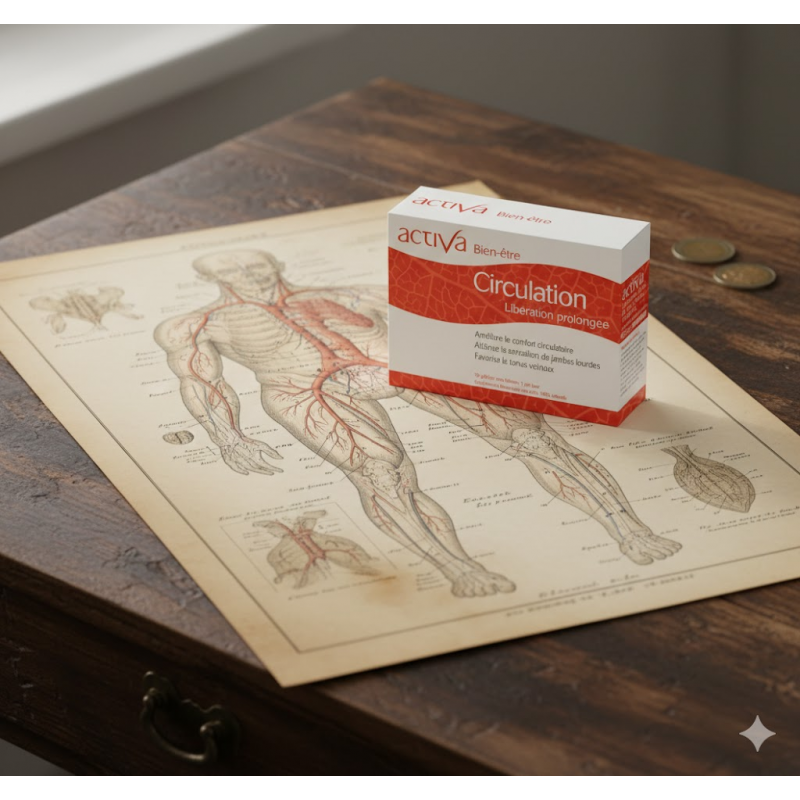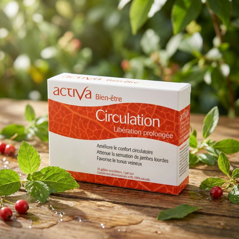 Le complément CIRCULATION BIEN-ÊTRE d'Activa propose une action de fond pour revitaliser vos jambes. Pour comprendre son action, il faut observer comment la Vigne rouge et l'Hibiscus agissent en synergie pour favoriser le drainage et le retour veineux. On suppose que cette association aide à désengorger les tissus en facilitant l'élimination naturelle de l'eau.