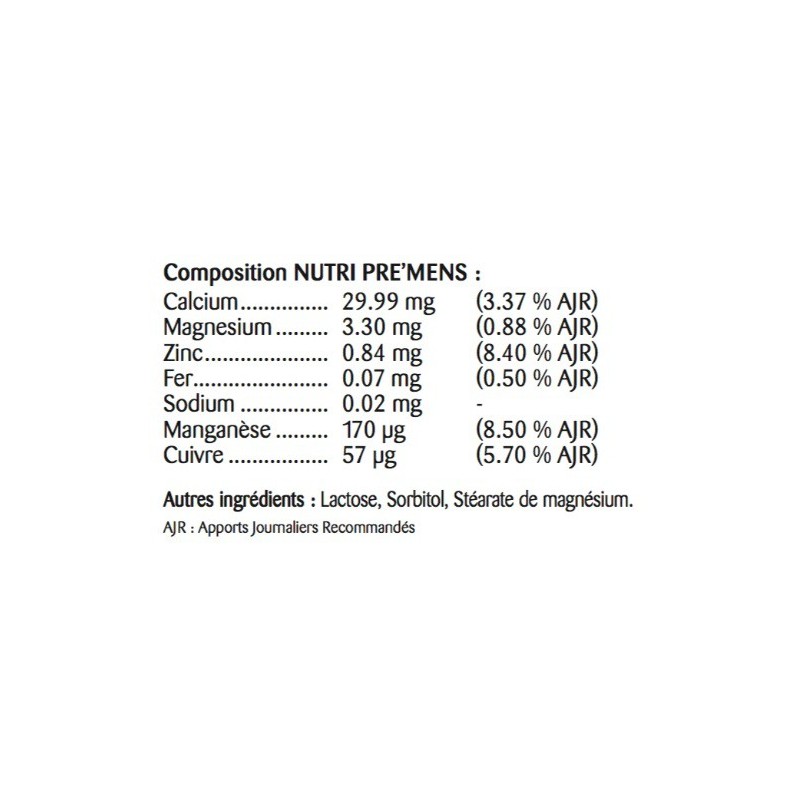 - L'astuce santé : Pour optimiser les effets de NUTRI Pre-Mens, essayez de limiter les excitants (caféine, sucres raffinés) durant la période des règles. Les oligo-métaux travailleront ainsi sur un terrain moins inflammatoire, favorisant une action plus rapide sur les spasmes.